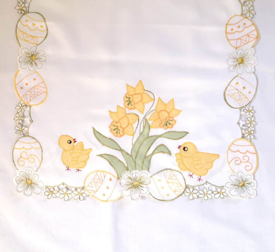 Tischläufer mit gesticktem Ostermotiv aus Narzissen und Enten